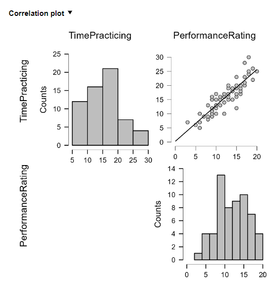 Selecting correlation plots will give you both a scatterplot and a histogram. There are other options for creating scatterplots which are covered in Section 11.