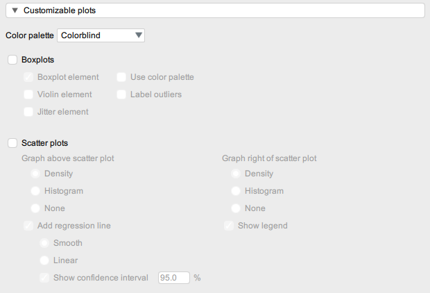 This menu is similar to the ‘Basic Plots’ menu but has additional options that allow you to further customize your graphs. There are two main sets of options relating to Boxplots and Scatterplots respectively.