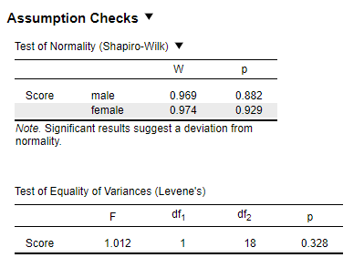 Assumption Checks. These help you decide whether any of the assumptions for conducting an independent t-test have been violated; normality of distribution and equality of variances. For equality of variances select ‘Levene’s’.